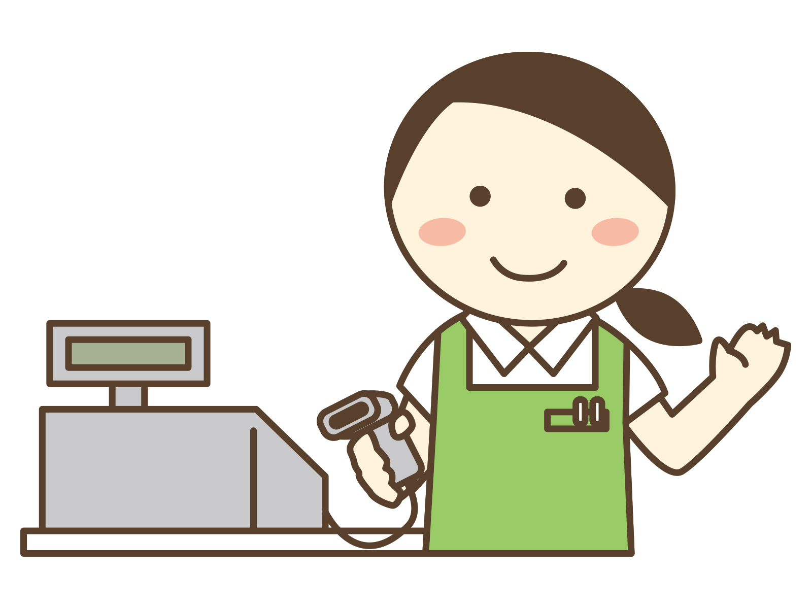 ◎バーコードで簡単レジの扱い、お客様が購入された商品をたたんで、買い物袋に入れる。(社員の方々も常駐しているのでサポート体制もばっちりです。)